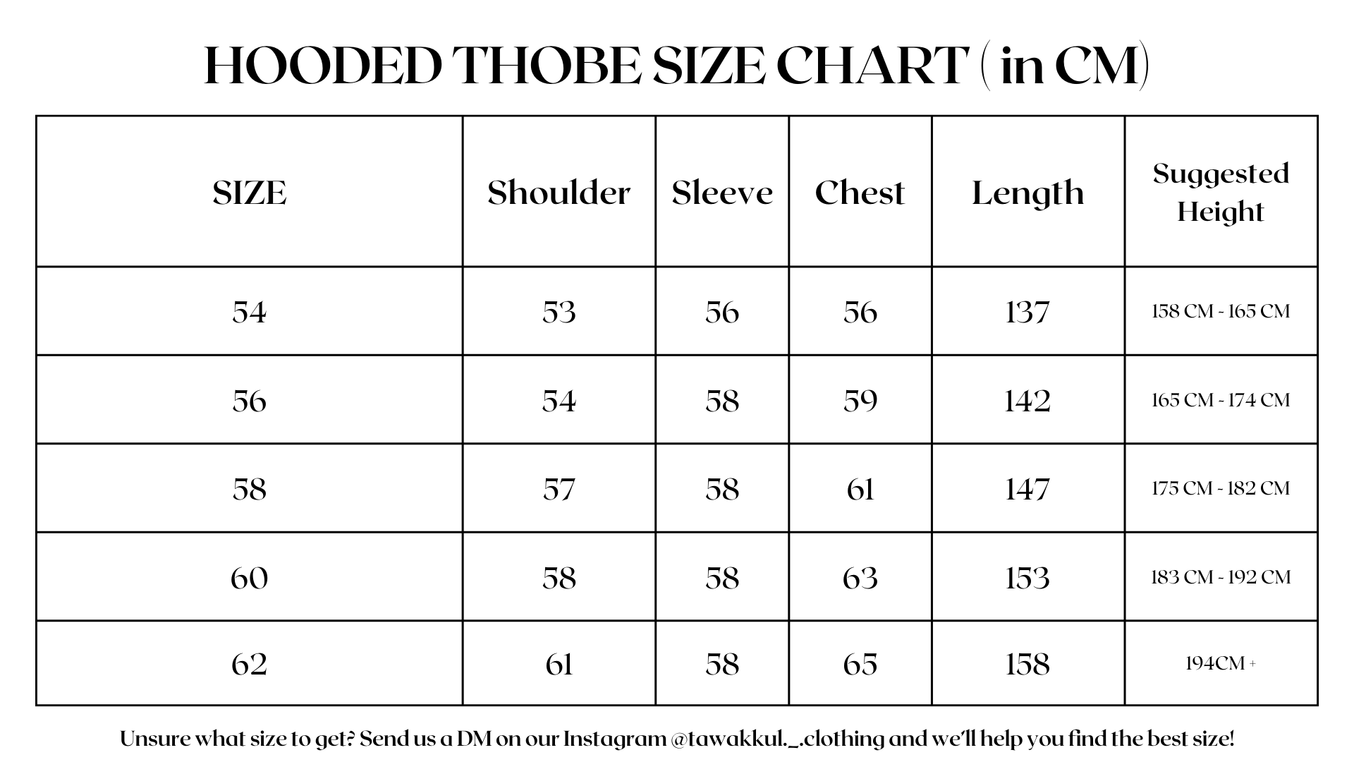 If your still unsure as to what size to choose, feel free to message us on instagram or drop us an email at contact@tawakkulclothing.com.